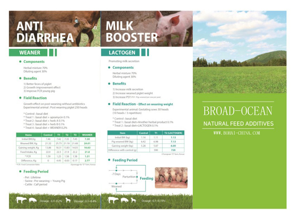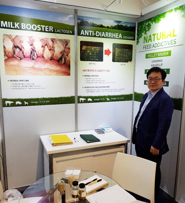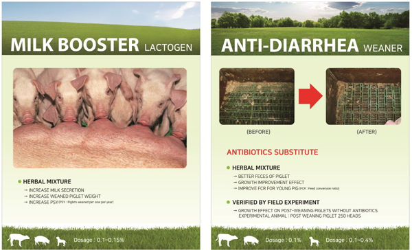本次展览重点推广用于母猪的MILK BOOSTER(LACTOGEN)和用于仔猪的ANTI-DIARRHEA (WEANER)。LACTOGEN作为一款母猪专用天然植物饲料添加剂产品,具有促进乳汁分泌、增加仔猪断奶体重(增加断奶重15%左右)、预防母猪便秘、增加母猪年产仔数(年均1-2头)等作用;而WEANER则是一款用于断奶仔猪的天然植物饲料添加剂产品,可预防断奶、转群、应激等各种因素引起的腹泻、促进猪只生长(与对照组相比,仔猪生长期内增重最高可达20%)、提高饲料报酬率等方面的功效。