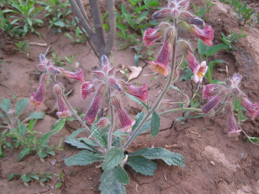 花具长0.5-3厘米之梗,梗细弱,弯曲而后上升,在茎顶部略排列成总状花序,或几乎全部单生叶腋而分散在茎上;花萼钟状,萼长1-1.5厘米,密被多细胞长柔毛和白色长毛,具10条隆起的脉;萼齿5枚,矩圆状披针形或卵状披针形抑或多少三角形,长0.5-0.6厘米,宽0.2-0.3厘米,稀前方2枚各又开裂而使萼齿总数达7枚之多;花冠长3-4.5厘米;花冠筒状而弯曲,外面紫红色,(另有变种,花为黄色,叶面背面为绿色)被多细胞长柔毛;花冠裂片,5枚,先端钝或微凹,内面黄紫色,外面紫红色,两面均被多细胞长柔毛,长5-7毫米,宽4-10毫米;雄蕊4枚;药室矩圆形,长2.5毫米,宽1.5毫米,基部叉开,而使两药室常排成一直线,子房幼时2室,老时因隔膜撕裂而成一室,无毛;花柱顶部扩大成2枚片状柱头。