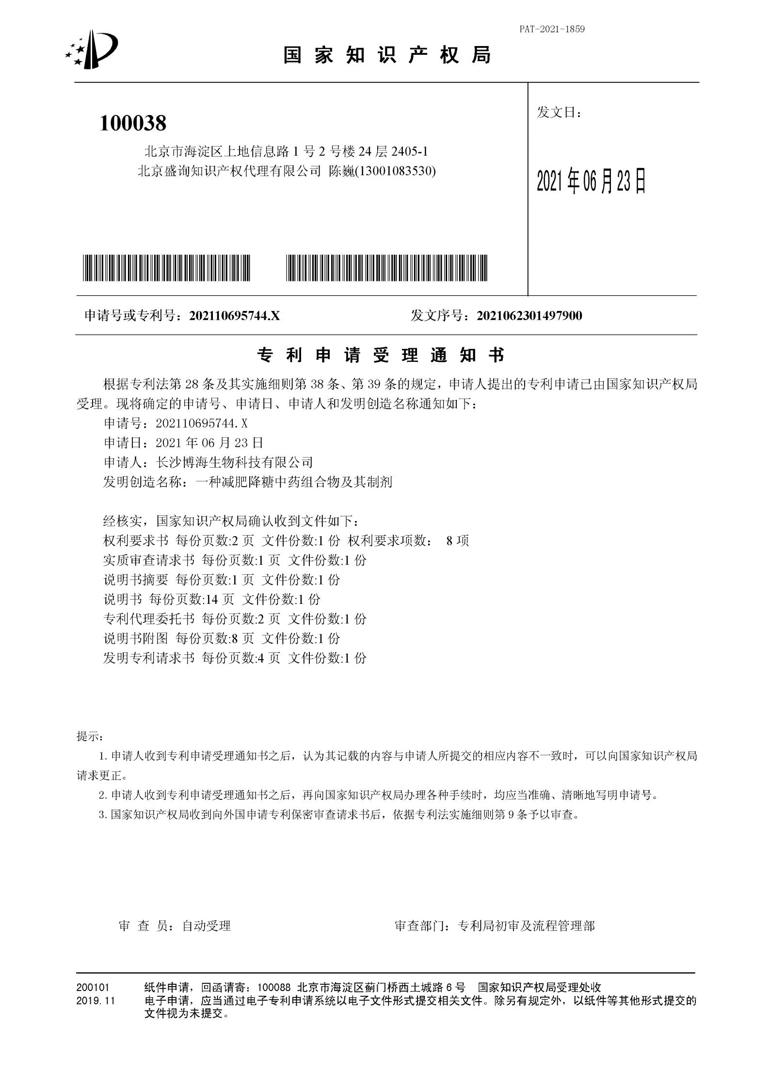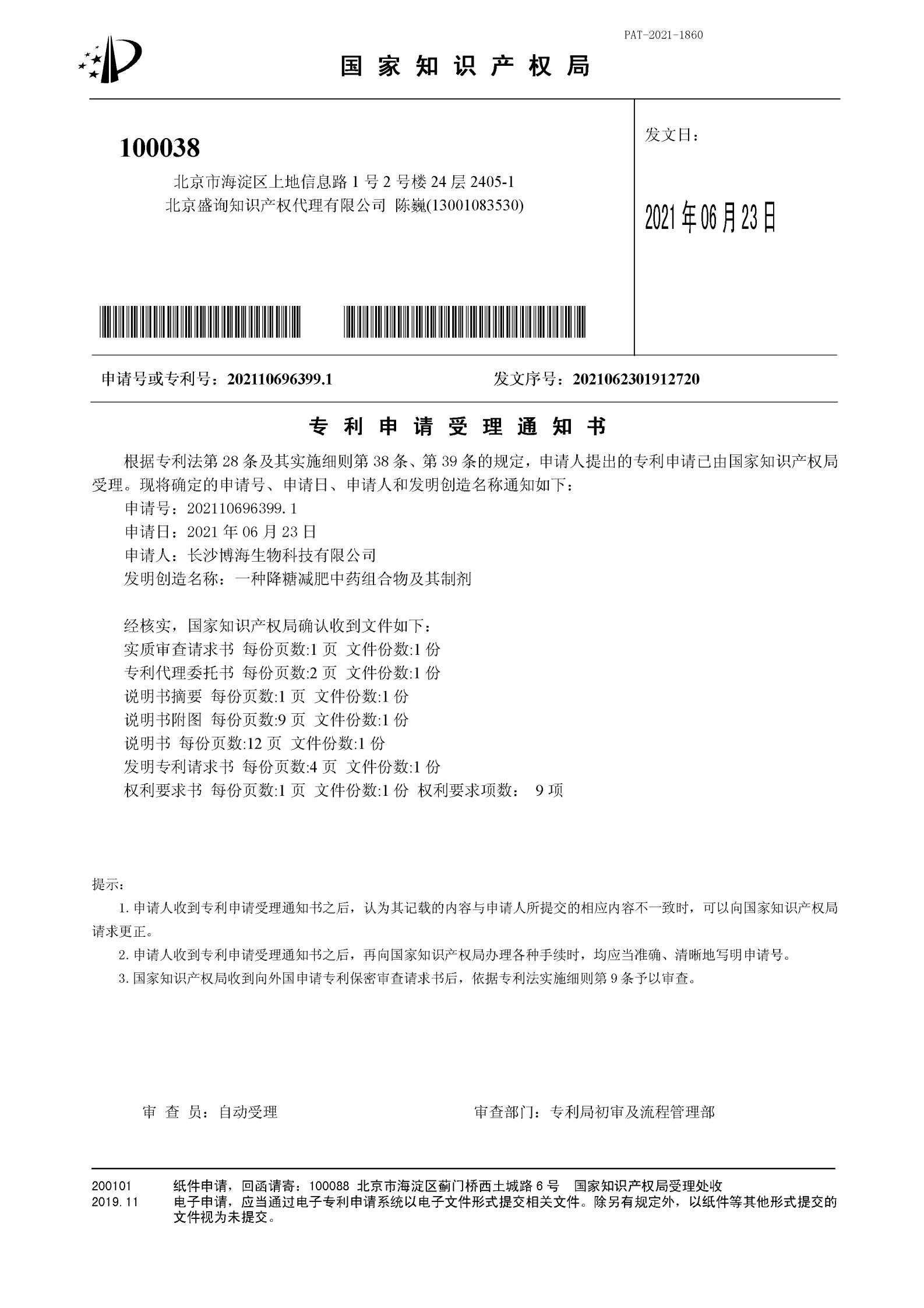 热烈祝贺我公司关于纯植物减肥降糖专利获得受理!