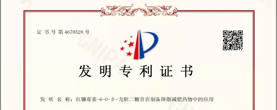 热烈祝贺我公司又一专利获得审批——红镰霉素-6-O-β-龙胆二糖苷在制备降脂减肥药物中的应用(证书号:4670528)。该专利保护期20年,是中韩两国科技工作者充分发挥各自科研、智力、人力、物力等资源优势,将科研成果转化为生产力,共同构建科研联盟、合作创新的结晶。
