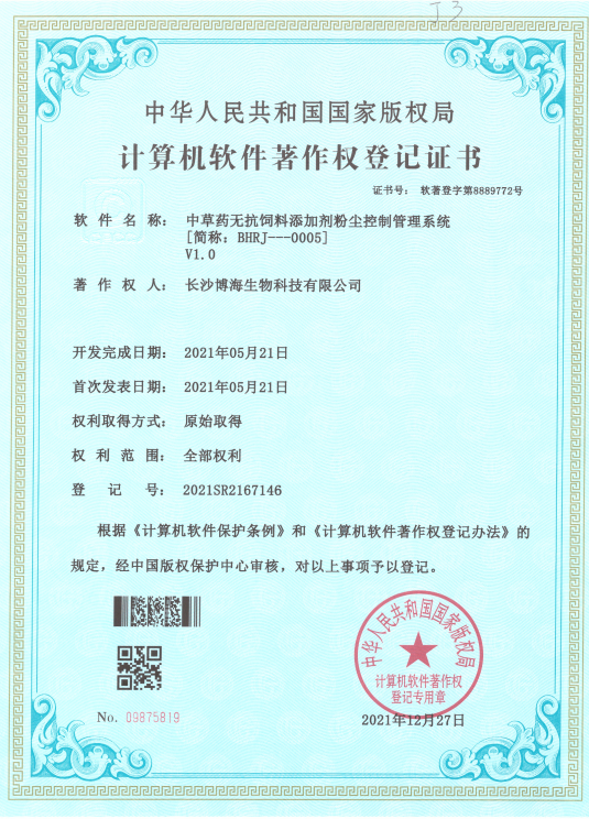日前,我公司新增“中草药无抗饲料添加剂加工工艺及应用效果分析平台”、“中草药无抗饲料添加剂智能调配控制系统”、“高纯度天然医药中间体制备管理控制系统”、“中小微企业化学危险品信息登记管理系统”、“中草药无抗饲料添加剂粉尘控制管理系统”5件软件著作权。