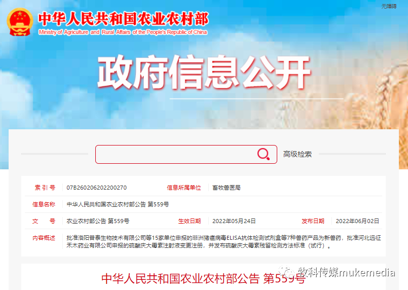 中华人民共和国农业农村部公告 第559号:批准洛阳普泰生物技术有限公司等15家单位申报的非洲猪瘟病毒ELISA抗体检测试剂盒等7种兽药产品为新兽药,批准河北远征禾木药业有限公司申报的硫酸庆大霉素注射液变更注册,并发布硫酸庆大霉素残留检测方法标准(试行)。
