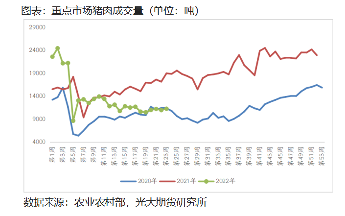 在供给相对稳定的情况下,需求端表现就决定了下半年猪价上行的高度,从全国重点市场畜禽肉成交数据来看,今年上半年猪肉、白条鸡的成交量不甚理想,不及2021年的水平,仅略高于新冠疫情爆发的2020年,今年疫情对于下游肉类的需求影响已经逐渐显现。