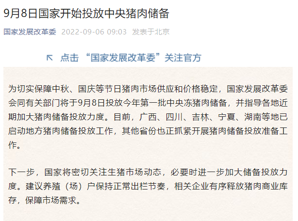 据国家发改委9月6日消息为切实保障中秋、国庆等节日猪肉市场供应和价格稳定,国家发展改革委会同有关部门将于9月8日投放今年第一批中央冻猪肉储备,并指导各地近期加大猪肉储备投放力度。目前,广西、四川、吉林、宁夏、湖南等地已启动地方猪肉储备投放工作,其他省份也正抓紧开展猪肉储备投放准备工作。