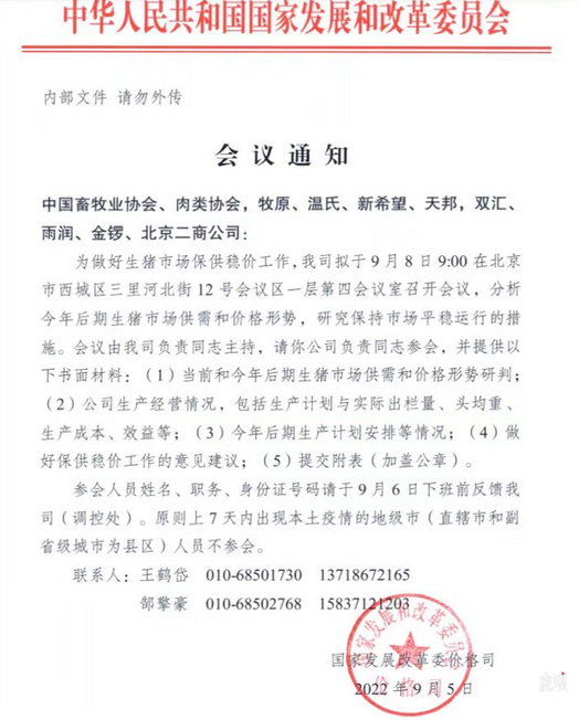 另外,继7月份发改委约谈大型猪企屠企后,据多位业内人士消息,为做好生猪市场保供稳价工作,国家发改委再次向10家生猪行业协会、企业、单位发布约谈通知,拟于9月8日开展研讨会,邀请中国畜牧业协会、肉类协会、牧原、温氏、新希望、天邦、双汇、雨润、金锣、北京二商公司等单位、公司参与会议。相关人士透露,在参会前上述公司需提交当前和今年后期生猪市场供需和价格形势研判、公司生产经营情况、今年后期生产计划安排和做好保供稳价工作的意见建议等资料。