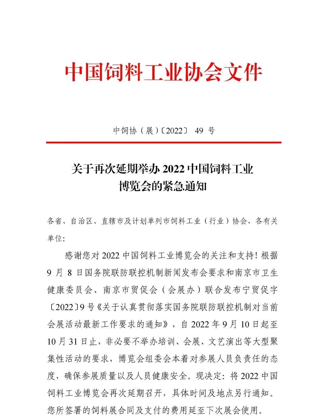 关于再次延期举办2022中国饲料工业博览会的紧急通知