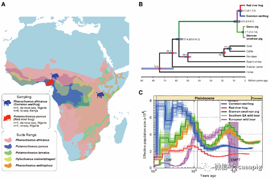 非洲猪科动物地理分布、系统发育关系与群体历史动态示意图在撒哈拉以南的非洲地区,非洲猪瘟病毒通过软蜱虫在野生猪科动物之间形成野外传播链。经过长期进化,包括疣猪属、巨林猪属等在内的非洲野生猪科动物,对该病毒产生了天然抗性,表现为宿主可携带非洲猪瘟病毒,但无临床症状,是研究非洲猪瘟抗性形成的宝贵遗传资源。