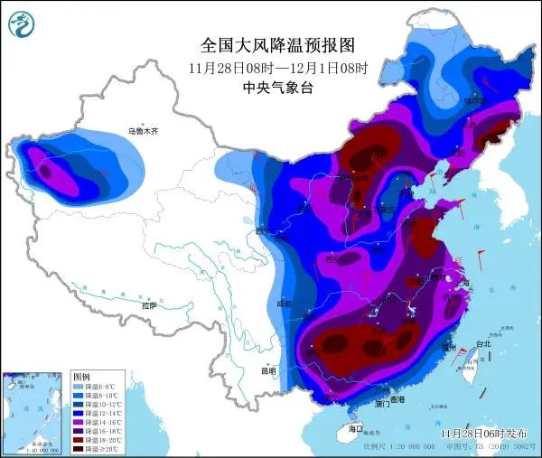 11月28日08时至30日08时,新疆南疆盆地、内蒙古大部、西北地区东部、华北、辽宁、吉林东部以及黄淮、江南北部、华南北部等地气温将下降10~14℃,其中内蒙古中西部、山西北部、吉林东部、山东南部、江苏北部、贵州东部、湖南西部等地降温16℃以上;上述地区将有4~6级偏北风,阵风7~9级。