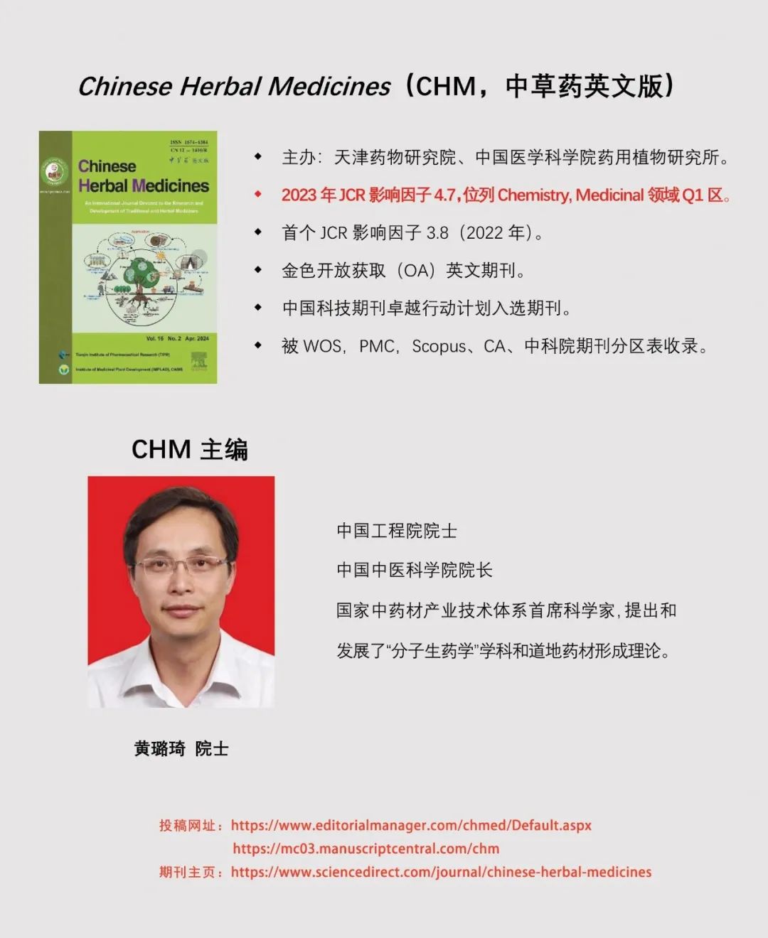 CHM将在主编黄璐琦院士的带领下,充分发挥编委、青年编委等专家的作用,努力将CHM打造成为具有国际影响力的中药学术期刊,为中医药国际传播搭建更高的平台,为我国中医药现代化和国际化做出贡献。