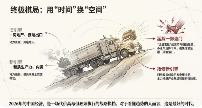 2026年经济风向剧变:从"稳健"到"适度宽松"的政策转向,意味着国家正为经济体注入强心剂。钱将流向核心资产和硬科技领域,而普通人要做的,是把握"新质生产力"风口,用良性负债锁定优质资产,在这场货币宽松与通缩对抗的战役中抢占先机。记住:旧地图找不到新大陆,唯有认知升级才能穿越周期。