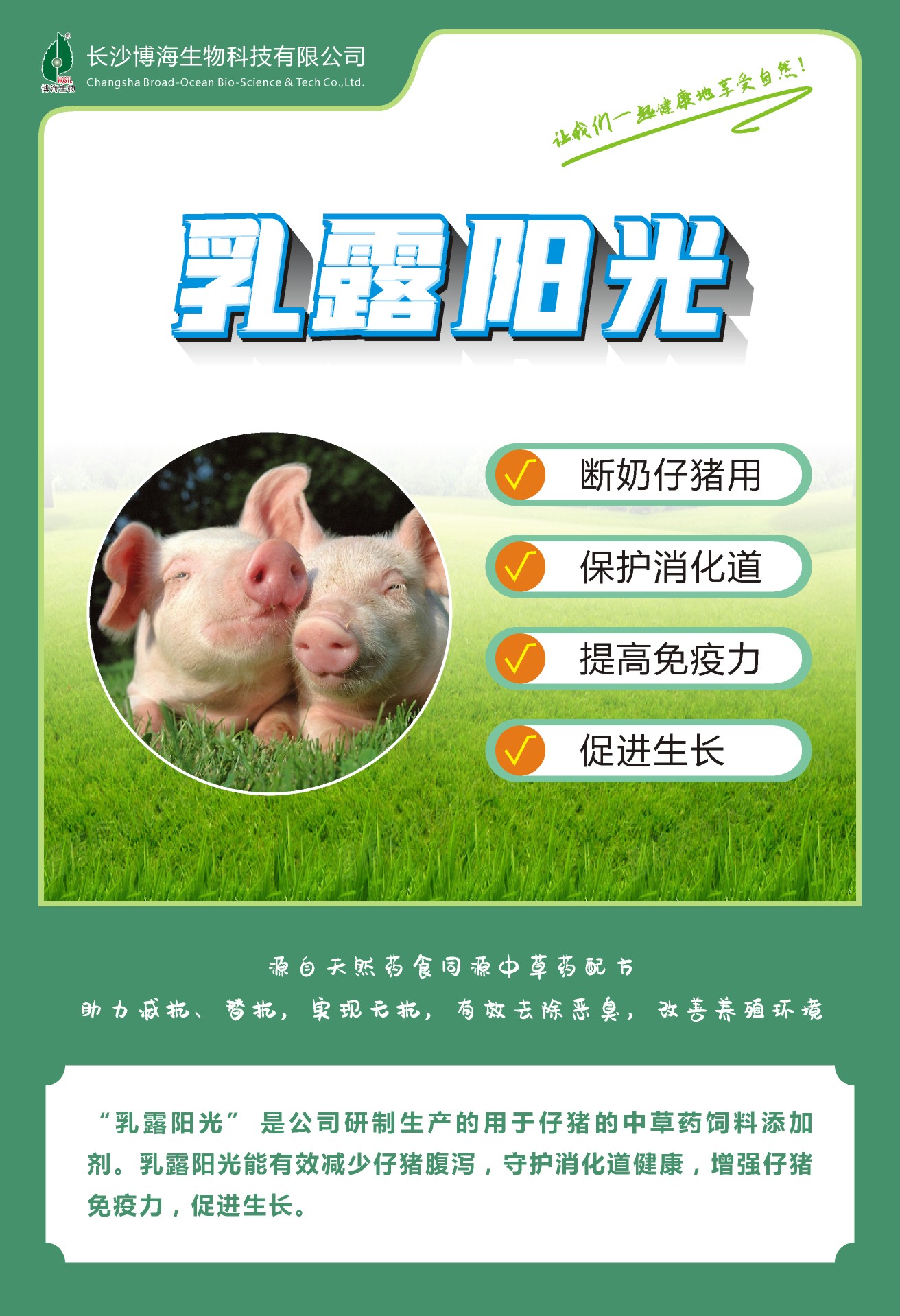 长沙博海生物科技有限公司一直致力于天然药食同源中草药配方的研发和推广,在该领域院士的指导下,公司参与编制《生猪养殖替抗指南》,助力减抗、替抗,实现无抗养殖,有效去除恶臭、改善养殖环境,“中医药+畜牧业” 跨界融合发展,从源头解决食品安全问题。同时使用我司产品能大幅提高肉品中神经酸(Nervonic acid)含量、改善脂肪结构和优化氨基酸比例,更符合FAO/WHO制定的优质蛋白中氨基酸的比例标准,肉质更美味更营养。公司天然替抗系列产品均具有自主知识产权,已销往韩国、泰国等海外市场,深受广大用户欢迎。